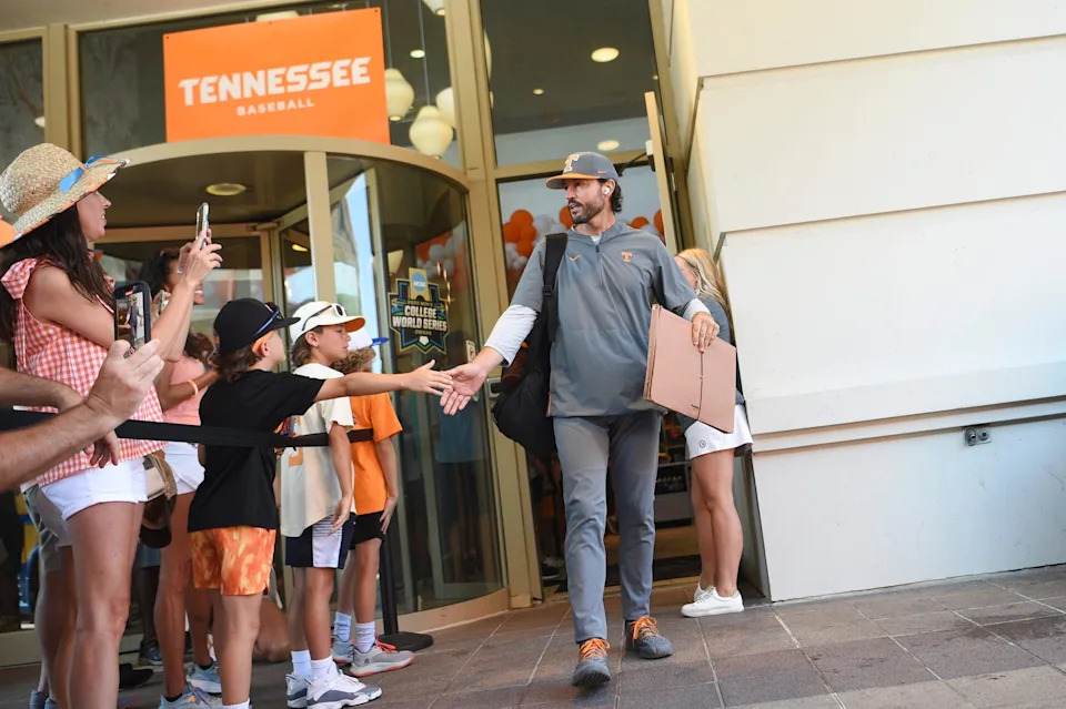 Tennessee head coach Tony Vitello leaves the hotel before the NCAA Men’s College World Series game between Tennessee and Stanford held at Charles Schwab Field in Omaha, Nebraska on Monday, June 19, 2023.