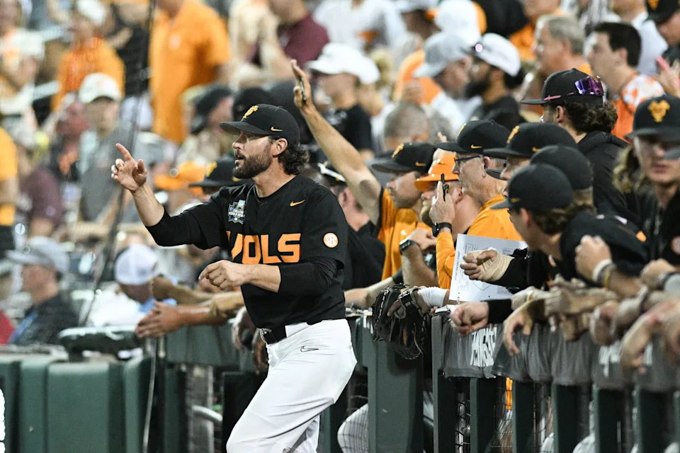 Tennessee Volunteers head coach Tony Vitello signals the team during the ninth inning at Charles Schwab Field Omaha on June 24, 2024.
