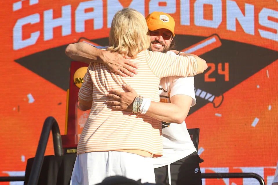 University of Tennessee Chancellor Donde Plowman hugs Tennessee head baseball coach Tony Vitello during the NCAA Baseball National Championship celebration in downtown Knoxville on Tuesday, June 25, 2024.
