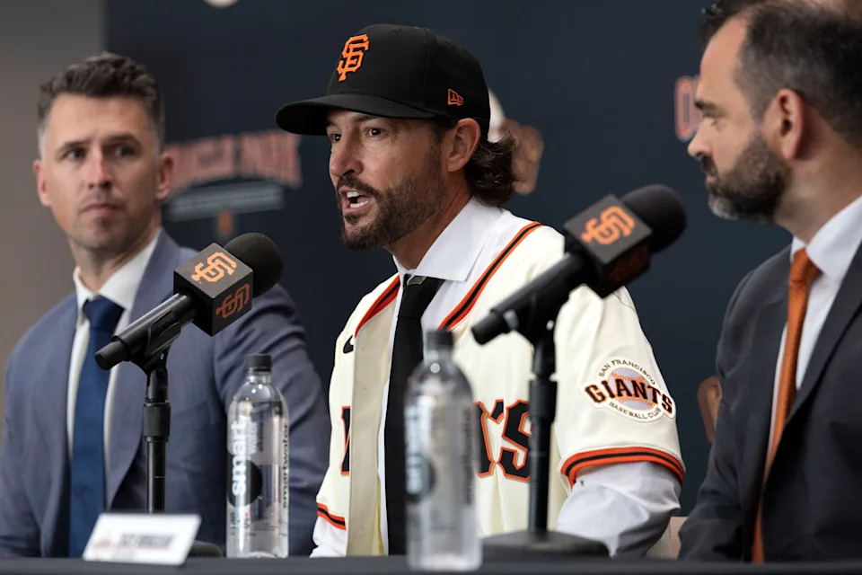 Tony Vitello (center) answers questions from the media as he is introduced as the new manager of the San Francisco Giants at Oracle Park on Oct. 30, 2025. He is flanked by president of baseball operations Buster Posey (left) and general manager Zack Minasian.