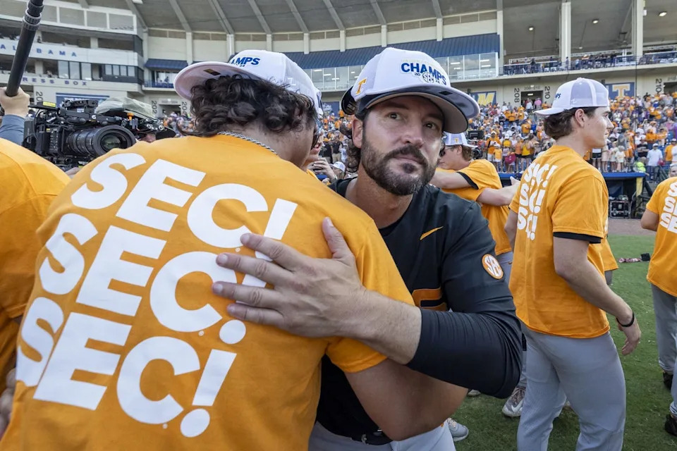 Tennessee Volunteers head coach Tony Vitello celebrates with his team after the championship game between Tennessee and LSU at the SEC Baseball Tournament at Hoover Metropolitan Stadium on May 26, 2024.