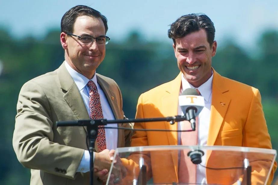 Tennessee baseball coach Tony Vitello waves to the crowd during the NCAA football match between Tennessee and Kentucky in Knoxville, Tennessee on Saturday, Oct. 29, 2022.