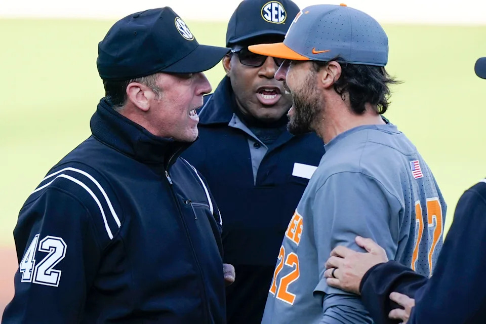 Tennessee head coach Tony Vitello (right) argues with umpires after a home run by right fielder Jordan Beck was wiped from the scoreboard after his bat was ruled illegal during the first inning of the game against Vanderbilt at Hawkins Field Friday, April 1, 2022 in Nashville.