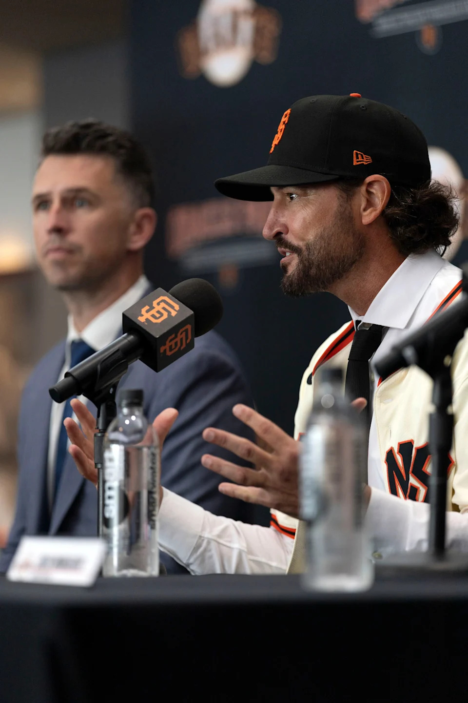 Tony Vitello (right) answers questions from the media as he is introduced as the new manager of the San Francisco Giants at Oracle Park on Oct. 30, 2025. He is joined by president of baseball operations Buster Posey.