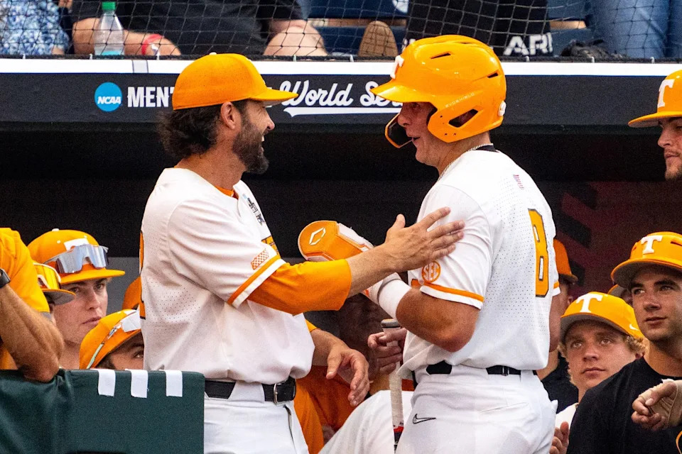 Tennessee Volunteers head coach Tony Vitello talks with left fielder Dylan Dreiling (8) after a run scored against the Texas A&M Aggies during the second inning at Charles Schwab Field Omaha on June 22, 2024.