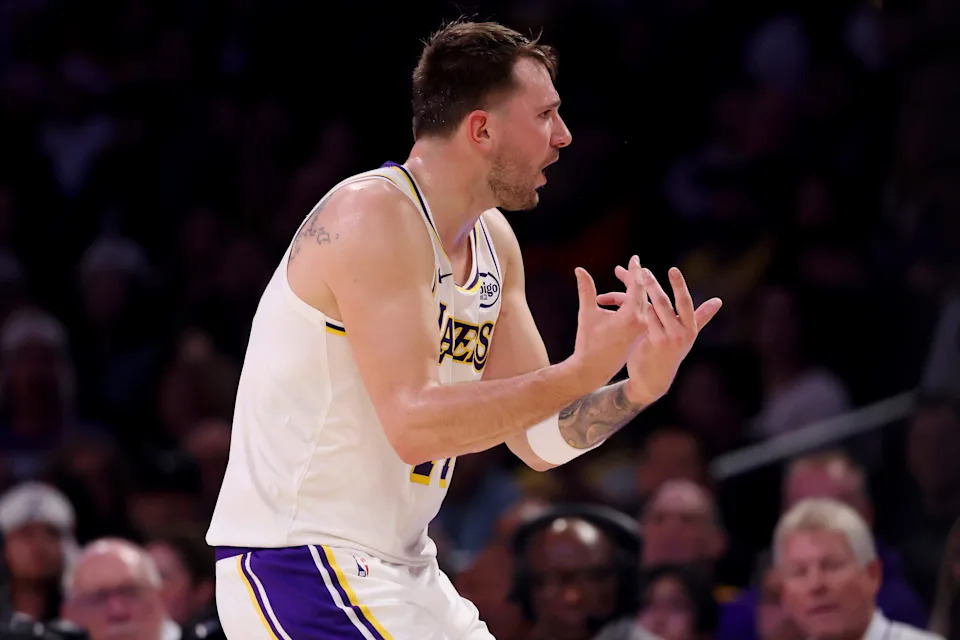 Luka Doncic #77 of the Los Angeles Lakers reacts to a referee on a Lakers foul during a 135-118 win over the LA Clippers at Crypto.com Arena on November 25, 2025 in Los Angeles, California.
