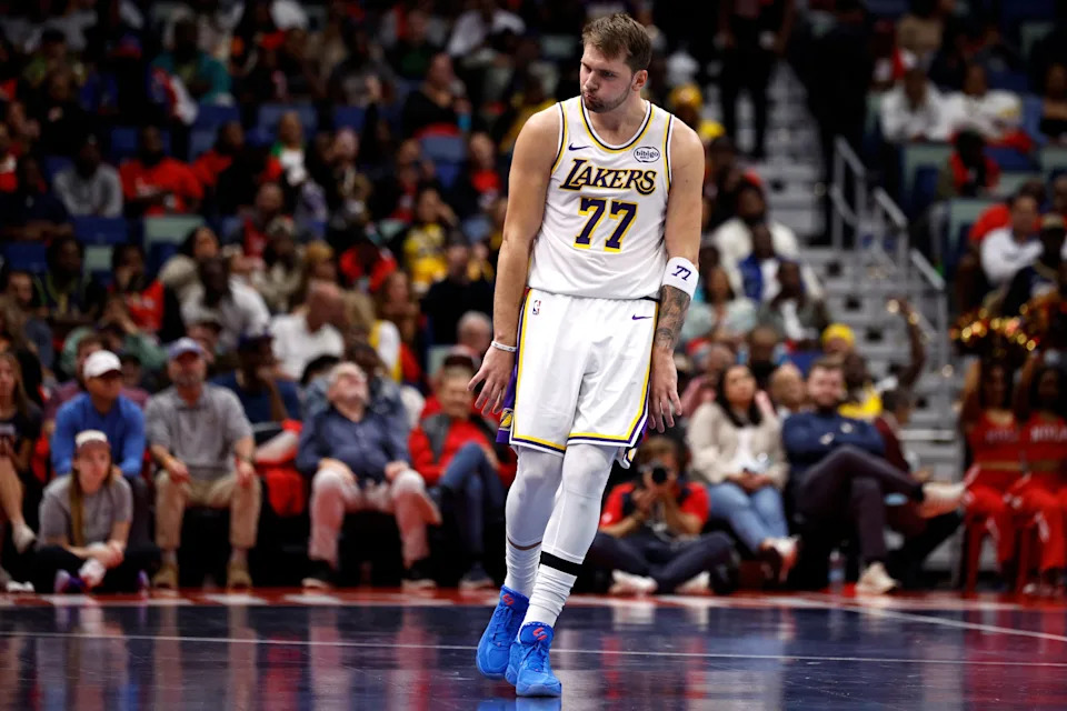 Luka Doncic #77 of the Los Angeles Lakers reacts after scoring a three-point basket during the second quarter of an 2025 Emirates NBA Cup game against the New Orleans Pelicans at Smoothie King Center on November 14, 2025 in New Orleans, Louisiana.