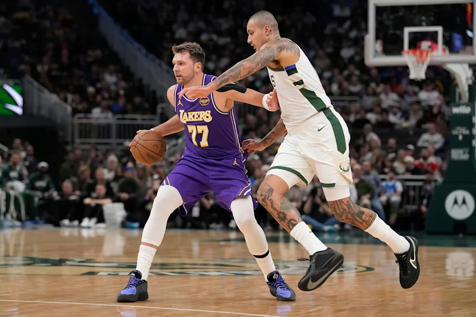 Luka Doncic #77 of the Los Angeles Lakers defends Giannis Antetokounmpo #34 of the Milwaukee Bucks during the first quarter at Fiserv Forum on November 15, 2025 in Milwaukee, Wisconsin.