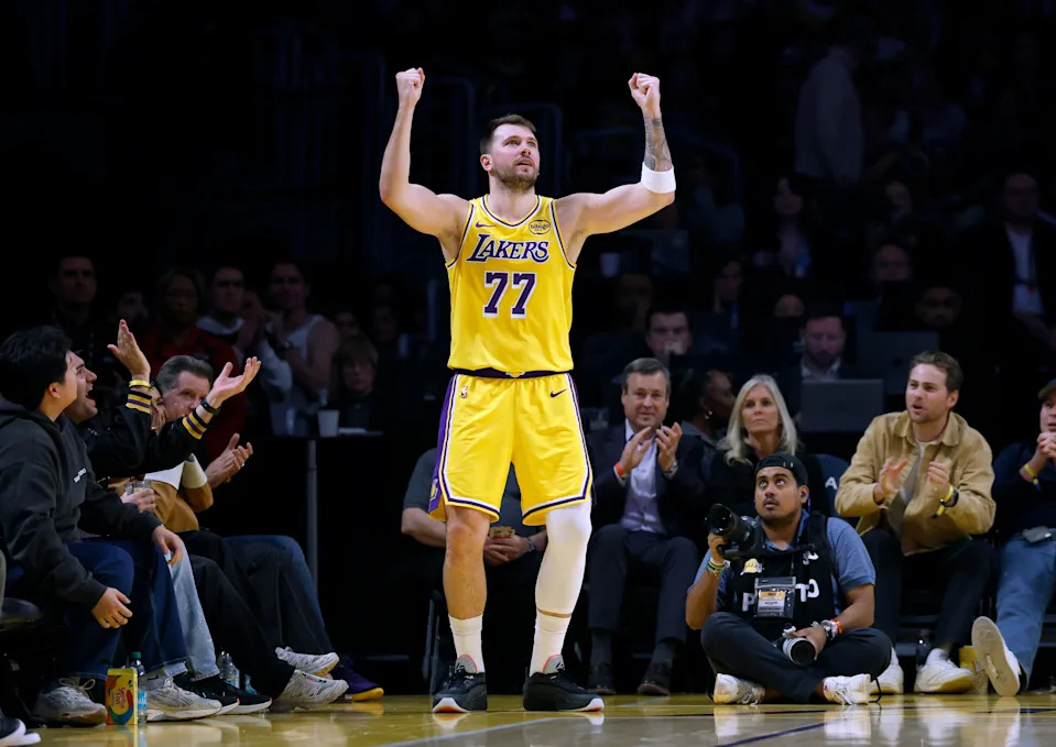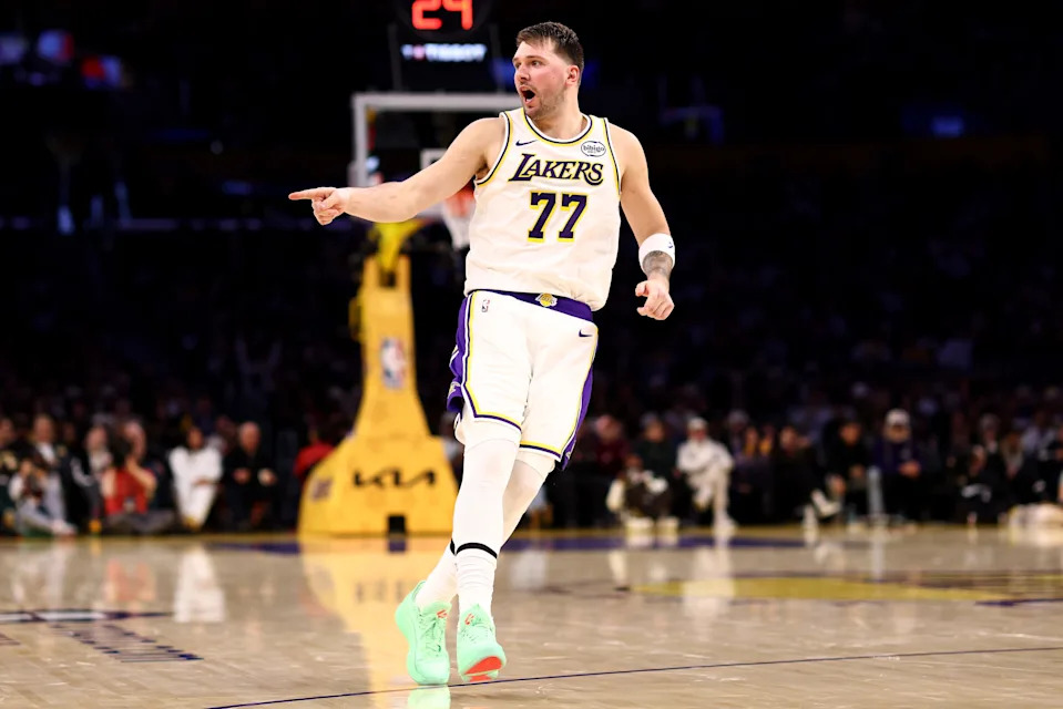 Luka Doncic #77 of the Los Angeles Lakers reacts during a 133-121 Lakers win over the New Orleans Pelicans at Crypto.com Arena on November 30, 2025 in Los Angeles, California.