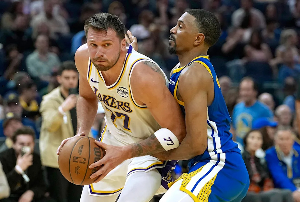 Luka Doncic #77 of the Los Angeles Lakers is trapped by Jonathan Kuminga #1 and Stephen Curry #30 of the Golden State Warriors in the fourth quarter of the game at Crypto.com Arena on October 21, 2025 in Los Angeles, California.
