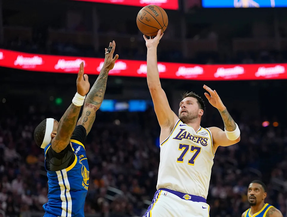 Luka Doncic #77 of the Los Angeles Lakers shoots over Gary Payton II #0 of the Golden State Warriors in the first half at Chase Center on February 28, 2026 in San Francisco, California.