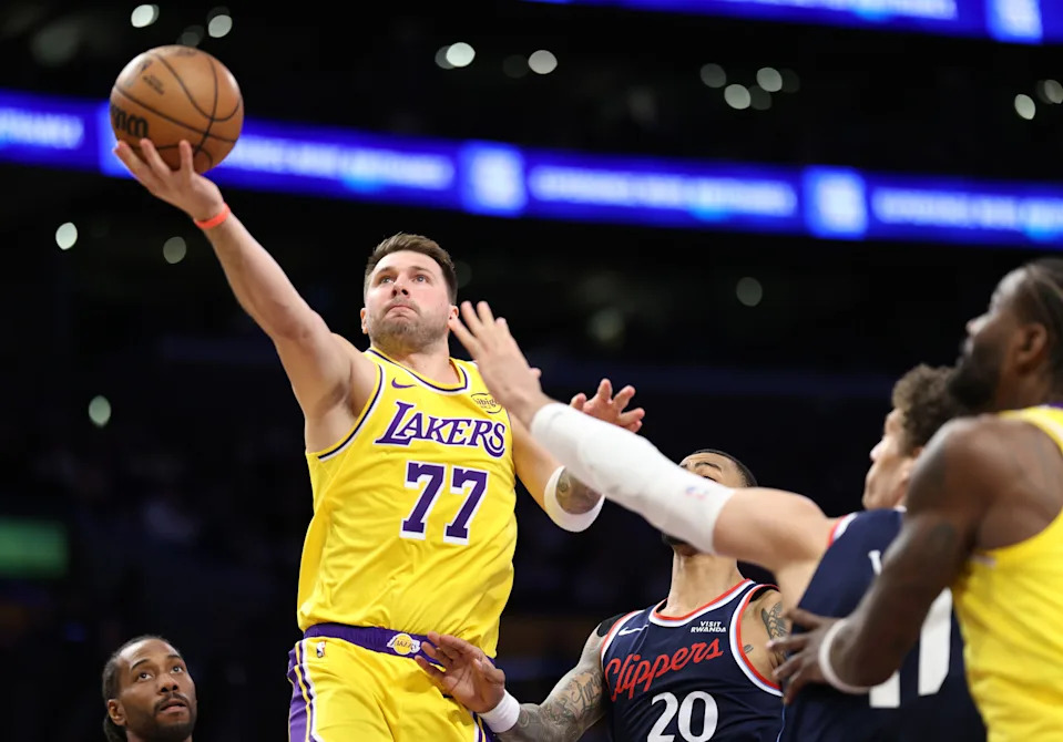 Luka Doncic #77 of the Los Angeles Lakers goes to the basket past John Collins #20 of the Los Angeles Clippers during the first half of their game at Crypto.com Arena on February 20, 2026 in Los Angeles, California.