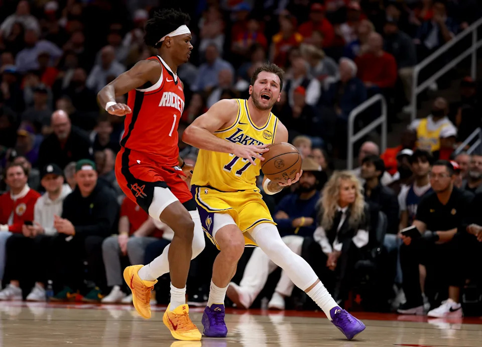 Luka Doncic #77 of the Los Angeles Lakers reacts while being defended by Amen Thompson #1 of the Houston Rockets during the first quarter of the game at Toyota Center on March 16, 2026 in Houston, Texas.