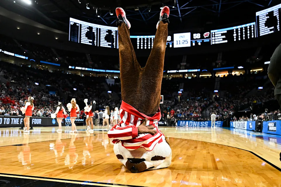 The Wisconsin Badgers mascot performs during a time out during the second half of a first round game of the men’s 2026 NCAA Tournament against the High Point Panthers at Moda Center on March 19, 2026 in Portland.