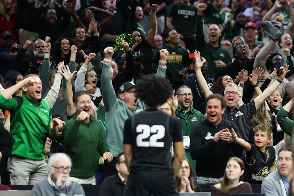 Wright State Raiders fans celebrate after a Wright State Raiders guard TJ Burch (22) scores during the second half against the Virginia Cavaliers during a first round game of the men’s 2026 NCAA Tournament at Xfinity Mobile Arena on March 20, 2026 in Philadelphia, PA.