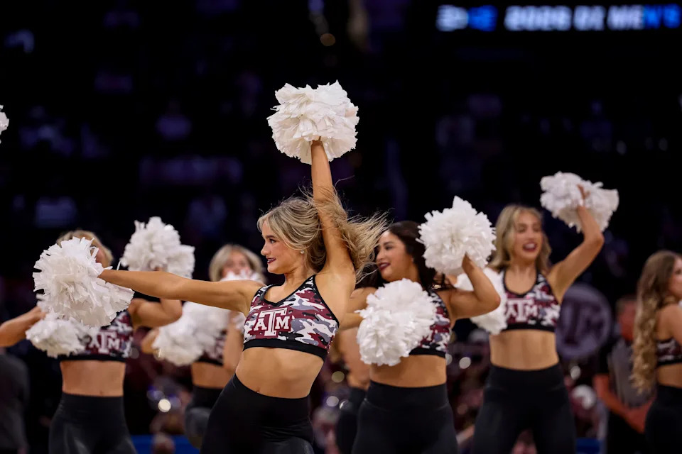 Texas A&M Aggies cheerleaders during a first round game of the men’s 2026 NCAA Tournament at Paycom Center on March 19, 2026 in Oklahoma City.