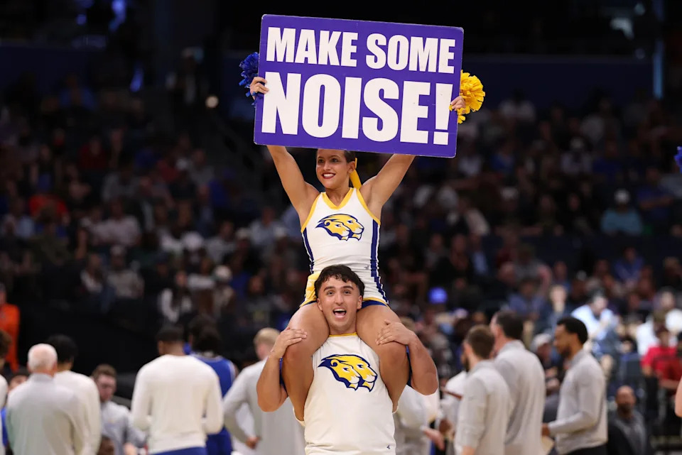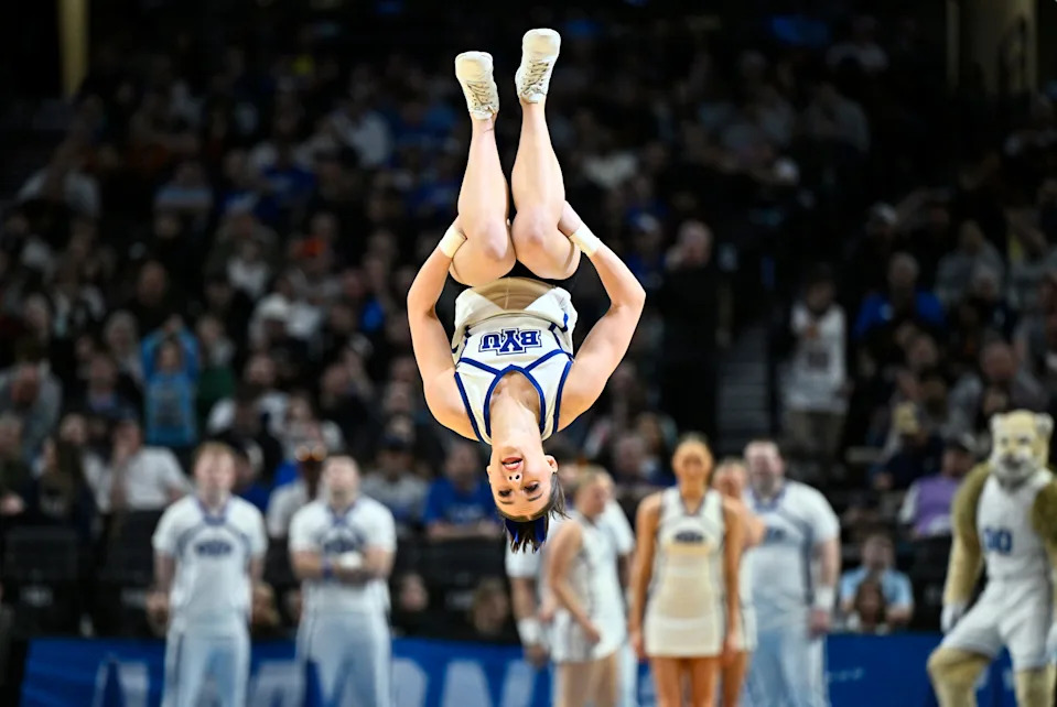 The High Point Panthers cheerleaders react during the second half of a first round game of the men’s 2026 NCAA Tournament against the Wisconsin Badgers at Moda Center on March 19, 2026 in Portland, Or.
