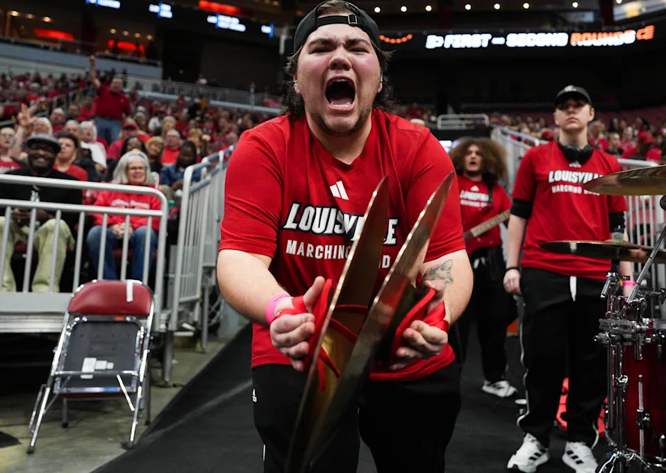 Garth Noble of the Louisville pep band is amped at the 2026 NCAA Women’s March Madness basketball tournament at the KFC Yum Center In Louisville, Kentucky. March 21, 2026.