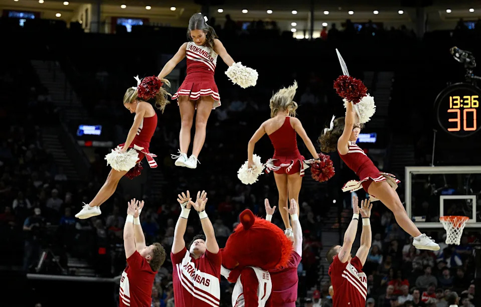Arkansas Razorbacks cheerleaders in the second half against the Hawaii Rainbow Warriors during a first round game of the men’s 2026 NCAA Tournament at Moda Center on March 19, 2026 in Portland, Ore.