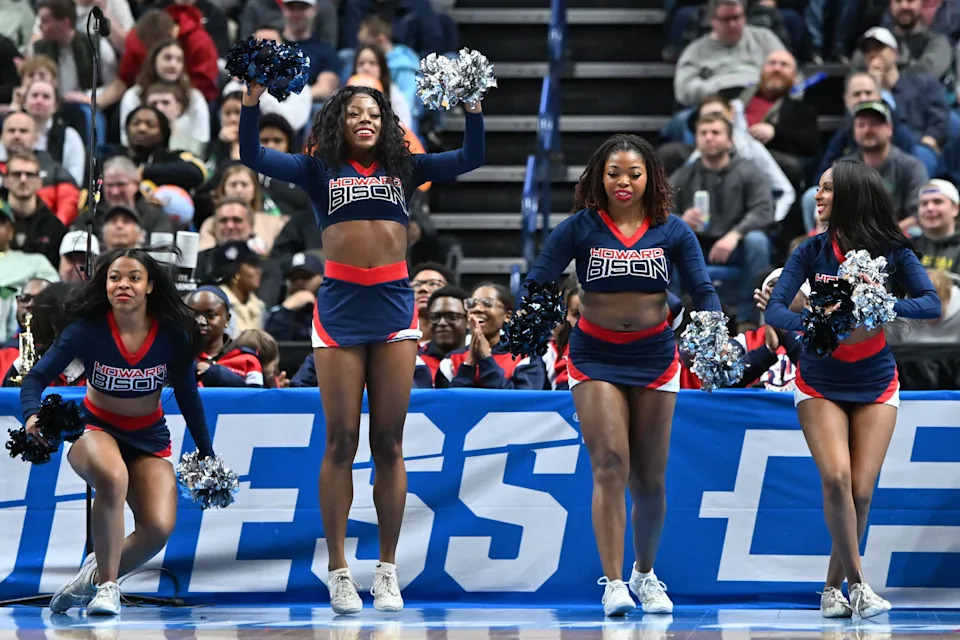 Howard Bison cheerleaders perform during a first round game of the men’s 2026 NCAA Tournament against the Michigan Wolverines at Keybank Center on Mar 19, 2026 in Buffalo, NY.