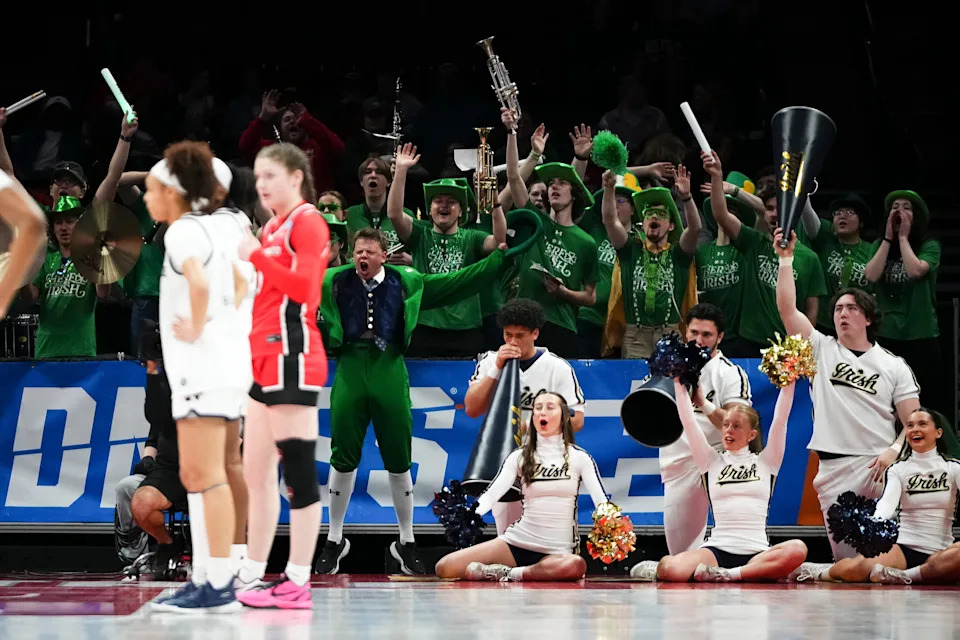 The Notre Dame Fighting Irish band and spirit squad cheer during the first round of the NCAA women’s basketball tournament against the Fairfield Stags at Ohio State’s Schottenstein Center in Columbus on March 21, 2026.