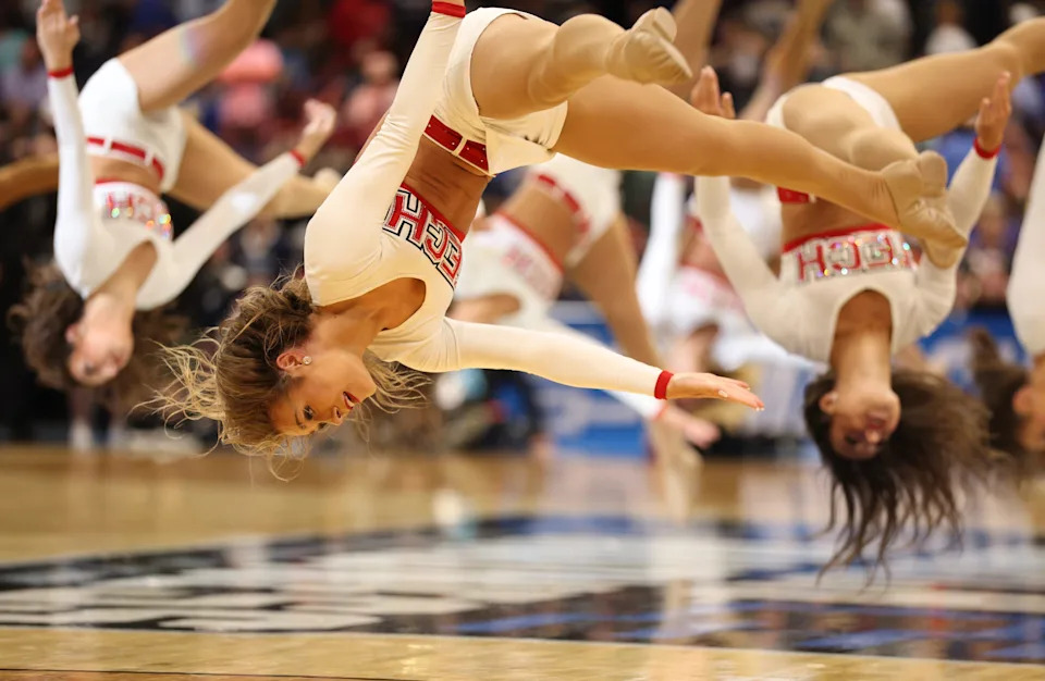 Texas Tech Red Raiders cheerleaders in the first half against the Akron Zips during a first round game of the men’s 2026 NCAA Tournament at Benchmark International Arena on March 20, 2026 in Tampa, Fla.