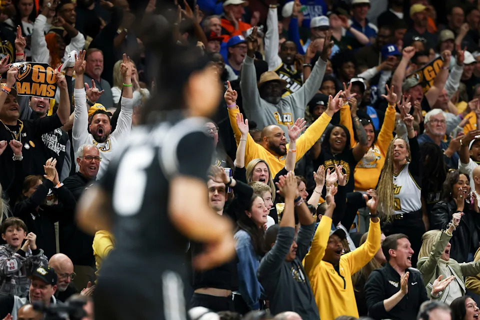 VCU Rams fans react after a 3-pointer by Terrence Hill Jr. #6 of the VCU Rams in the first round of the 2026 NCAA Men’s Basketball Tournament at Bon Secours Wellness Arena on March 19, 2026 in Greenville, SC.
