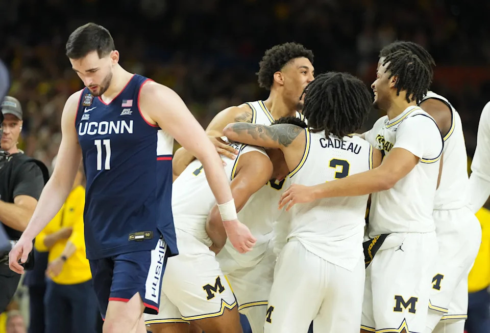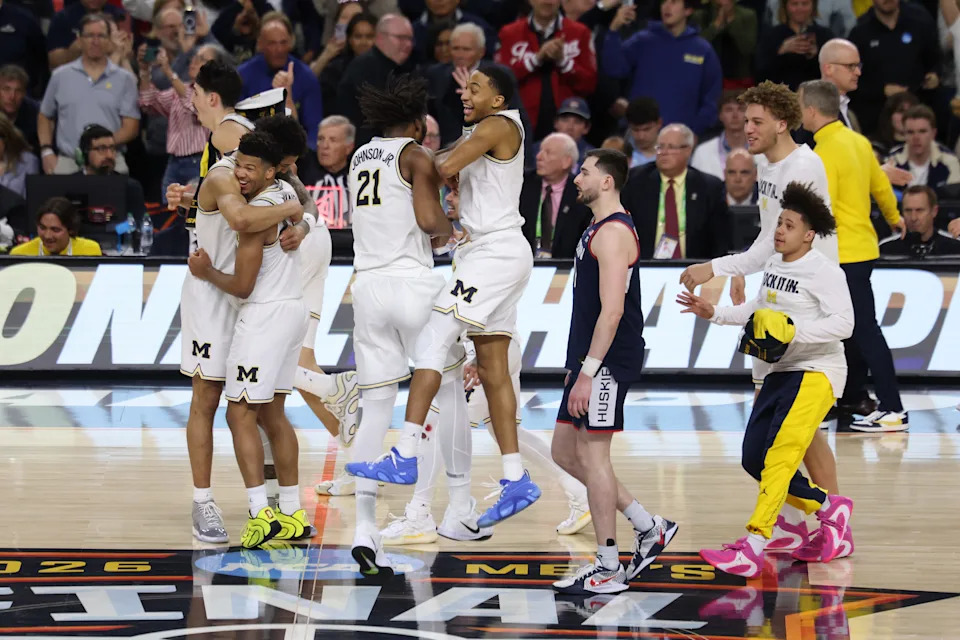 Above, the Michigan Wolverines celebrate after defeating the UConn Huskies 69-63 in the National Championship of the 2026 NCAA Men’s Basketball Tournament at Lucas Oil Stadium on April 06, 2026 in Indianapolis, Indiana.