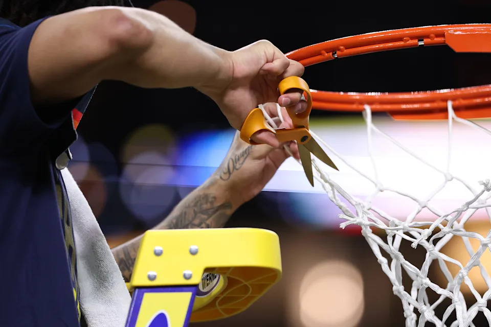 A detailed view of the net being cut down after the Michigan Wolverines defeated the UConn Huskies 69-63 in the National Championship of the 2026 NCAA Men’s Basketball Tournament at Lucas Oil Stadium on April 06, 2026 in Indianapolis, Indiana.
