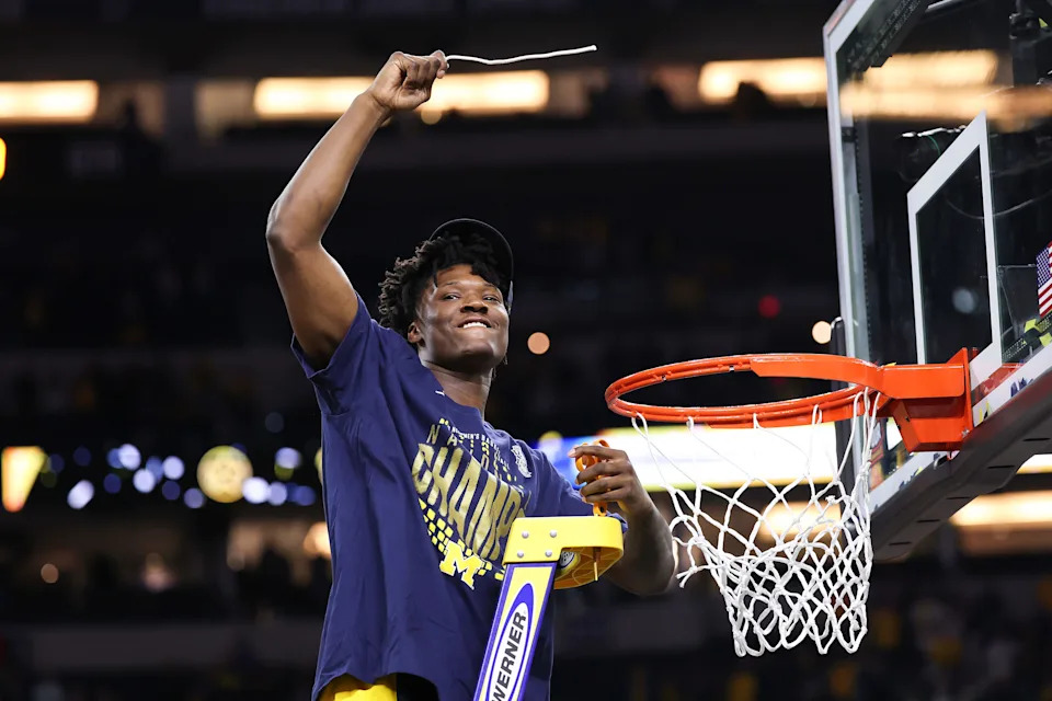 Yaxel Lendeborg #23 of the Michigan Wolverines celebrates as he cuts down the net after defeating the UConn Huskies 69-63 in the National Championship of the 2026 NCAA Men’s Basketball Tournament at Lucas Oil Stadium on April 06, 2026 in Indianapolis, Indiana.