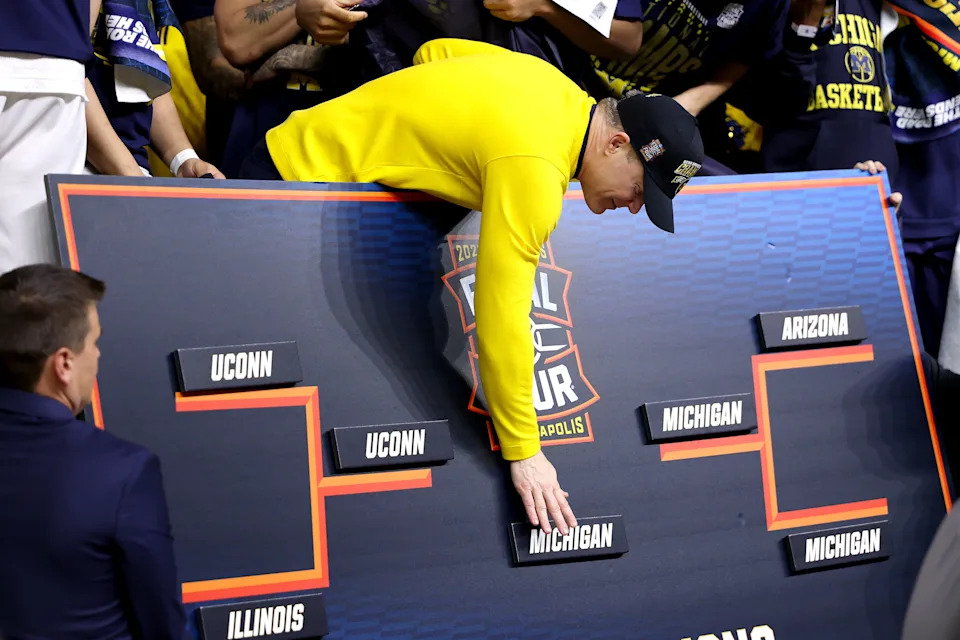 Head coach Dusty May of the Michigan Wolverines places the Michigan name on the championship bracket after defeating the UConn Huskies 69-63 in the National Championship of the 2026 NCAA Men’s Basketball Tournament at Lucas Oil Stadium on April 06, 2026 in Indianapolis, Indiana.