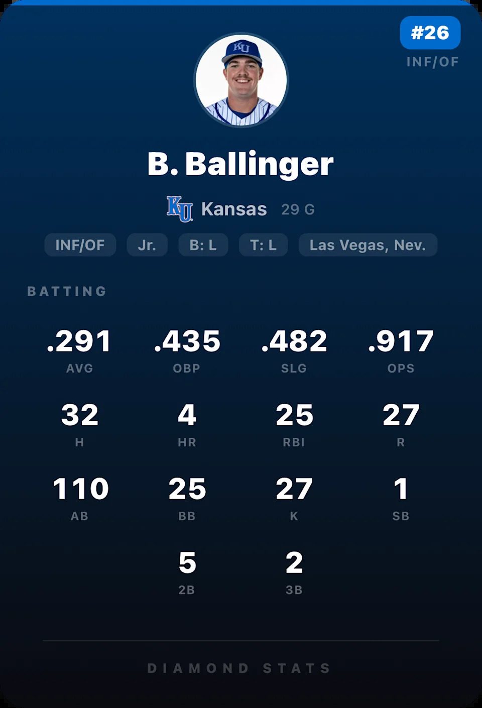 I also want to point out that these stat cards that I have generated have come from a new app focused on college baseball scores and stats, named Diamond: Baseball Stats. I would recommend the app to anyone with interest in college baseball or the draft.