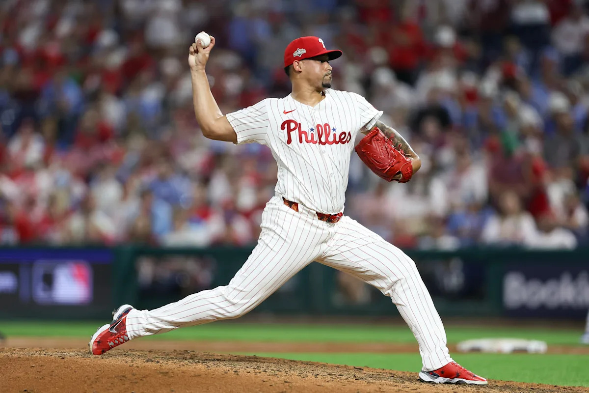 Oct 6, 2025; Philadelphia, Pennsylvania, USA; Philadelphia Phillies pitcher Jhoan Duran (59) throws a pitch against the Los Angeles Dodgers in the ninth inning during game two of the NLDS round for the 2025 MLB playoffs at Citizens Bank Park. Mandatory Credit: Bill Streicher-Imagn Images | Bill Streicher-Imagn Images