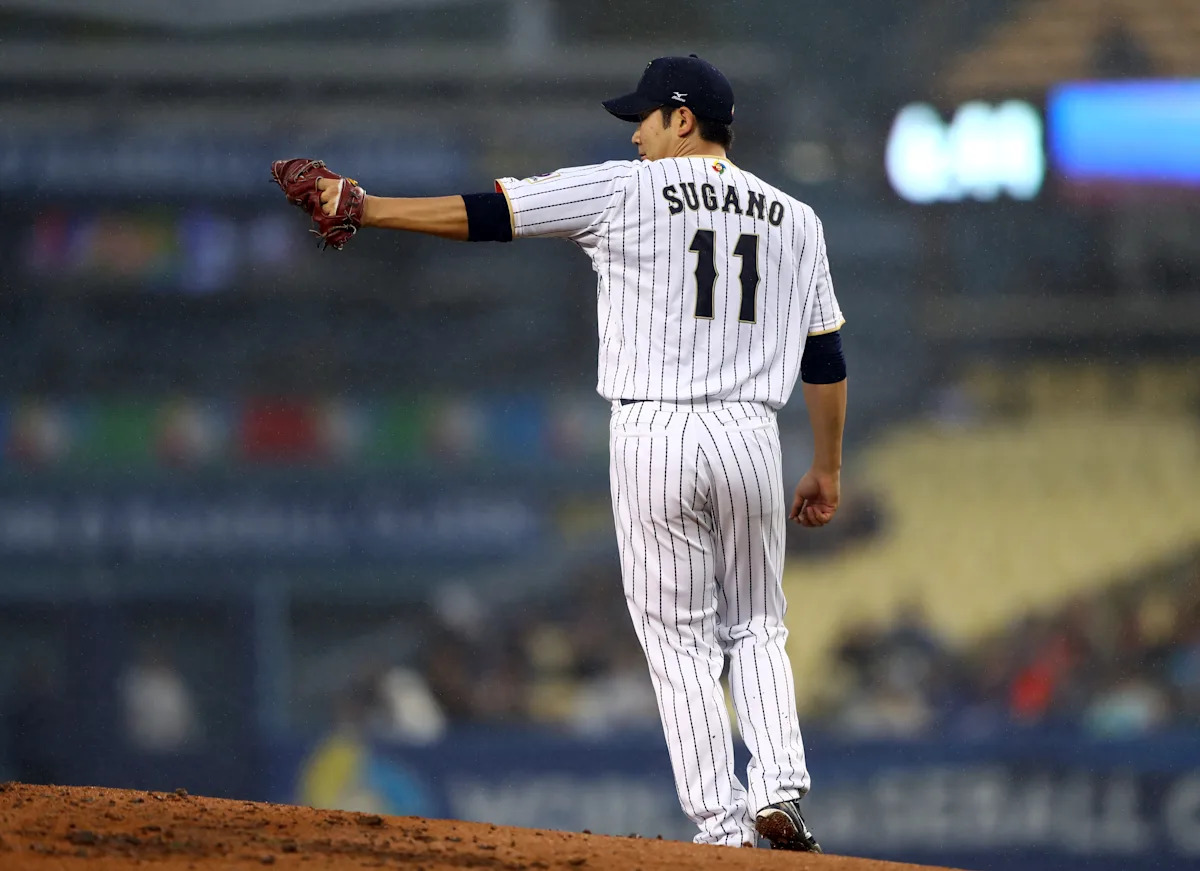 LOS ANGELES, CA – MARCH 21: Tomoyuki Sugano #11 of Team Japan reacts during Game 2 of the Championship Round of the 2017 World Baseball Classic against Team USA on Tuesday, March 21, 2017 at Dodger Stadium in Los Angeles, California. (Photo by Alex Trautwig/WBCI/MLB via Getty Images) | MLB via Getty Images