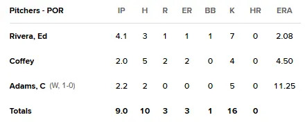For the Sea Dogs, Eduardo Rivera got the start and threw 4 1/3 strong innings, striking out seven. The win went to Cooper Adams, who threw 2 2/3 shutout innings and struck out five.