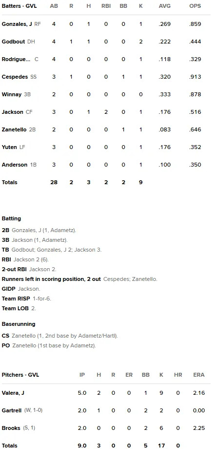 Greenville Drive 2, Hub City Spartanburgers 0 (BOX)