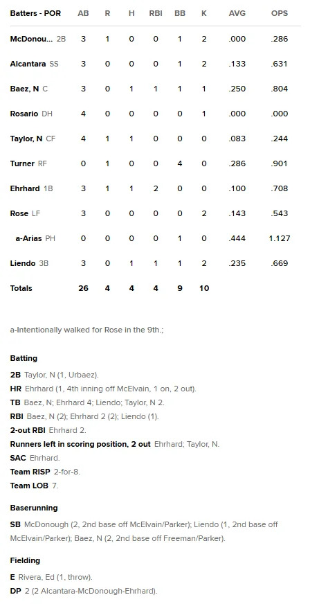 Portland won despite being outhit ten to four on the day, with a two-run home run by Drew Ehrhard as the biggest blast. Will Turner walked in all four of his plate appearances.
