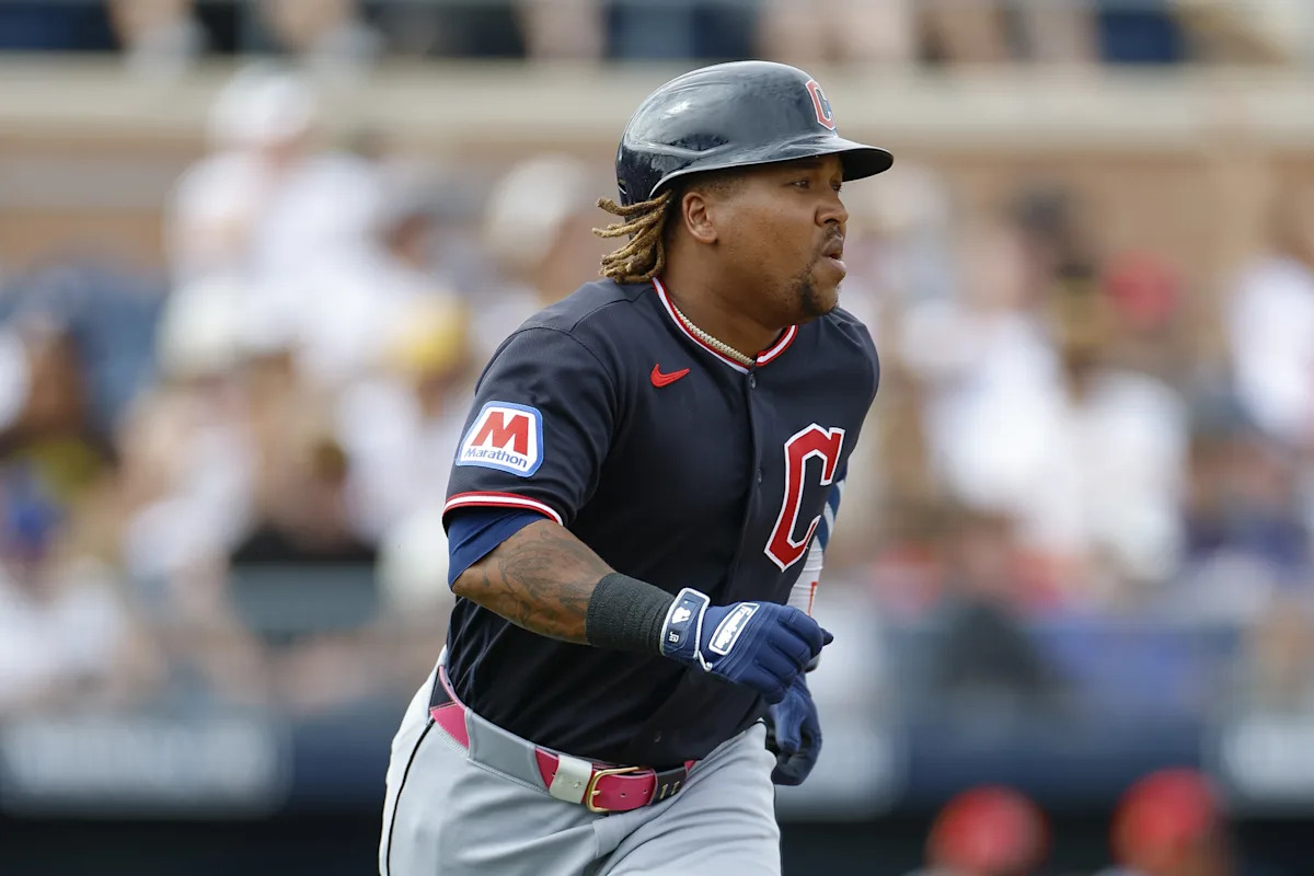 PEORIA, ARIZONA – MARCH 14: Jose Ramirez #11 of the Cleveland Guardians runs up the line on an RBI single during a Spring Training game against the San Diego Padres at Peoria Stadium on March 14, 2026 in Peoria, Arizona. (Photo by Brandon Sloter/Getty Images) | Getty Images