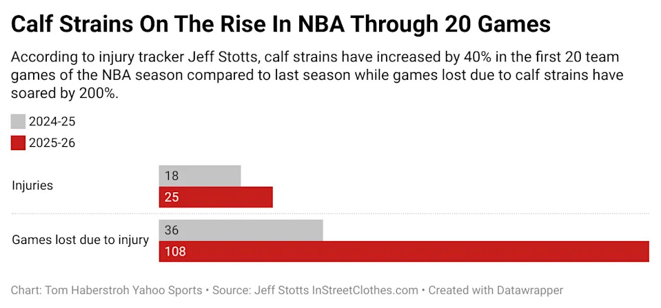 Ja Morant. Victor Wembanyama. Giannis Antetokounmpo. All suffered calf strains in the opening weeks of the season. All sidelined for multiple weeks. They are the biggest names, but there are more. A lot more. In the first 20 games of the 2025-26 season, we’ve seen a substantial increase in calf injuries (excluding contusions caused by blunt force), according to leading injury expert Jeff Stotts of InStreetClothes.com. This time last season, there were 18 calf injuries at the 20-game mark. This season, it’s up to 25 incidents, representing an increase of nearly 40%.