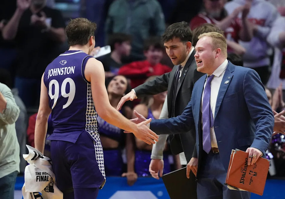 PORTLAND, OREGON – MARCH 19: Chase Johnston #99 of the High Point Panthers shakes hands as he walks off the court after their 83-82 win over the Wisconsin Badgers during the second half in the first round of the 2026 NCAA Men’s Basketball Tournament at Moda Center on March 19, 2026 in Portland, Oregon.