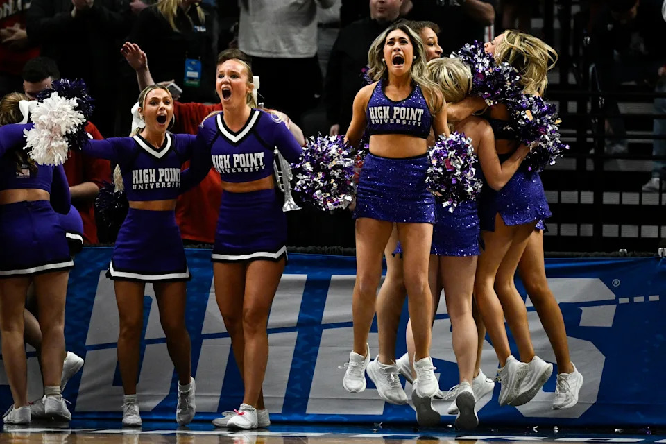 The High Point Panthers cheerleaders react during the second half of a first round game of the men’s 2026 NCAA Tournament against the Wisconsin Badgers at Moda Center on March 19, 2026 in Portland, Or.