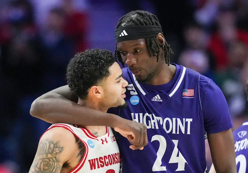 PORTLAND, OREGON – MARCH 19: Nick Boyd #2 of the Wisconsin Badgers and Youssouf Singare #24 of the High Point Panthers talk after the Panthers 83-82 win in regulation in the first round of the 2026 NCAA Men’s Basketball Tournament at Moda Center on March 19, 2026 in Portland, Oregon.