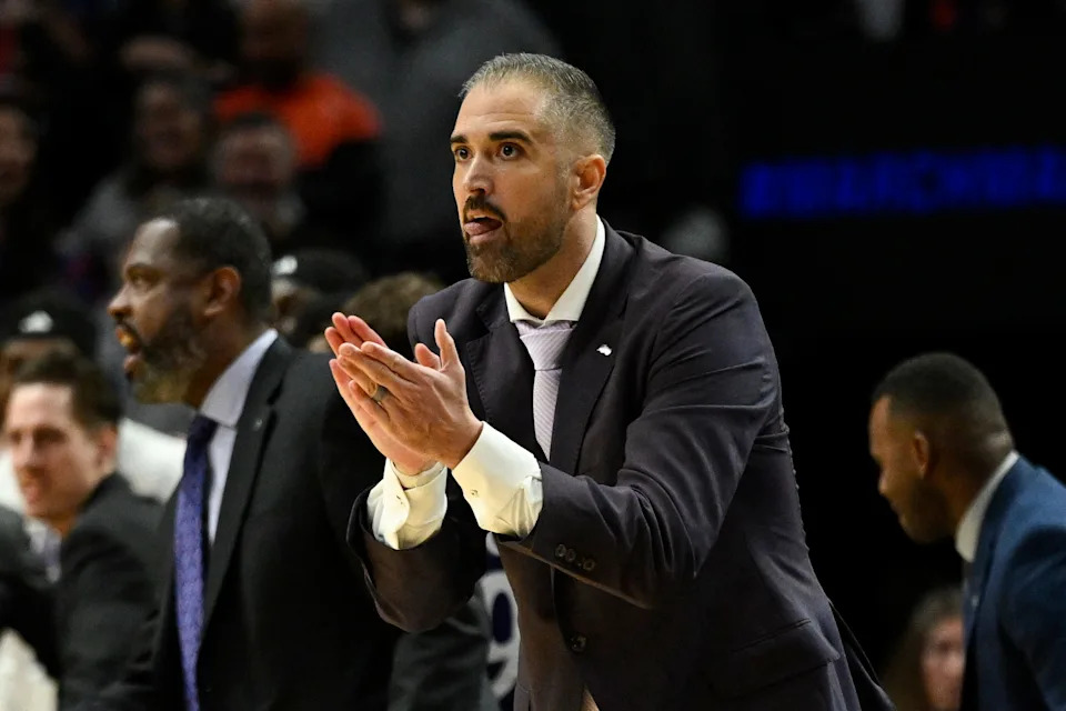High Point Panthers head coach Flynn Clayman watches his players during a practice session ahead of the first round of the men’s 2026 NCAA Tournament at Moda Center.