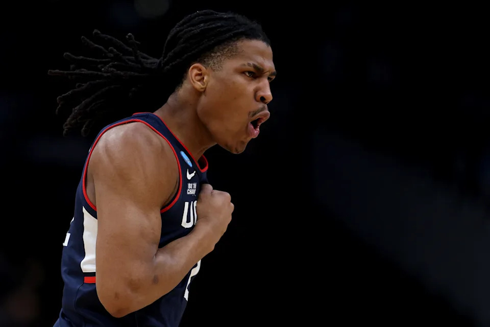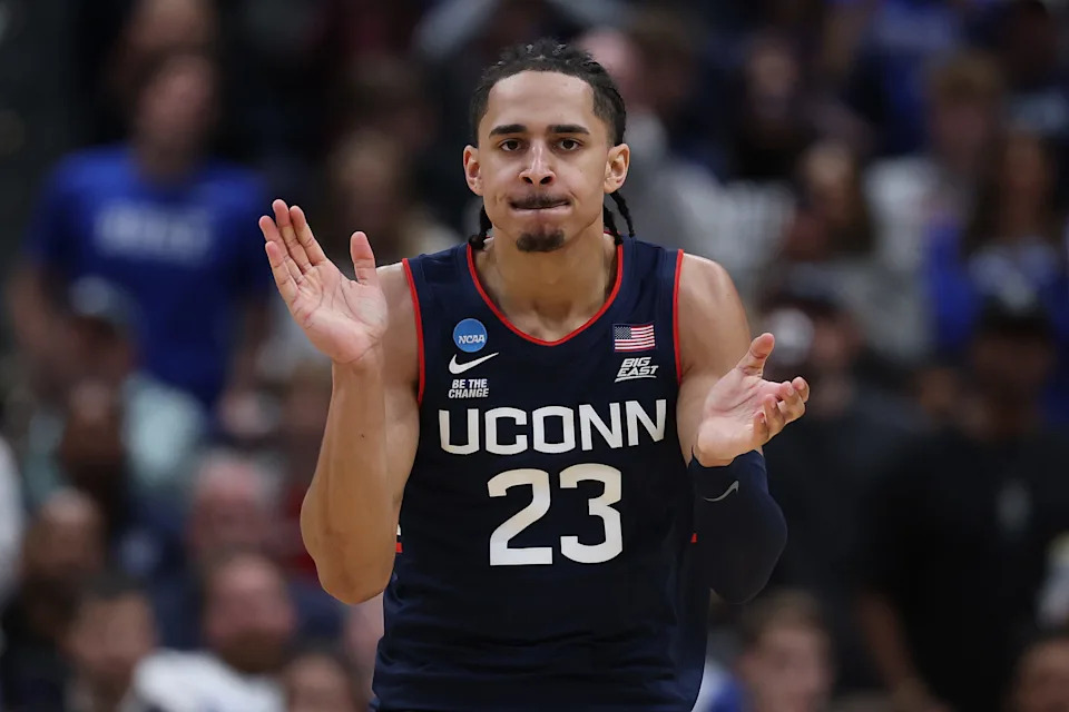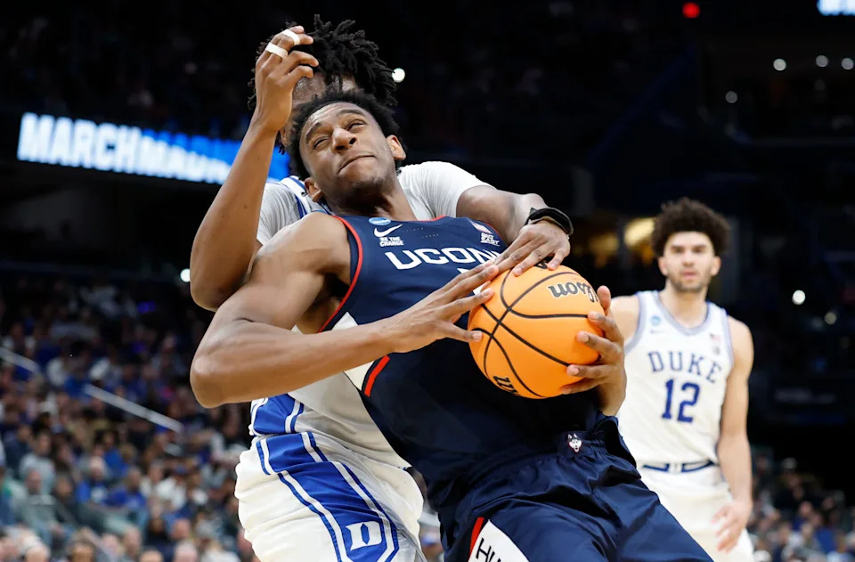 Jayden Ross #23 of the UConn Huskies reacts during the second half of a game against the Duke Blue Devils in the Elite Eight of the 2026 NCAA Men’s Basketball Tournament at Capital One Arena on March 29, 2026 in Washington, DC