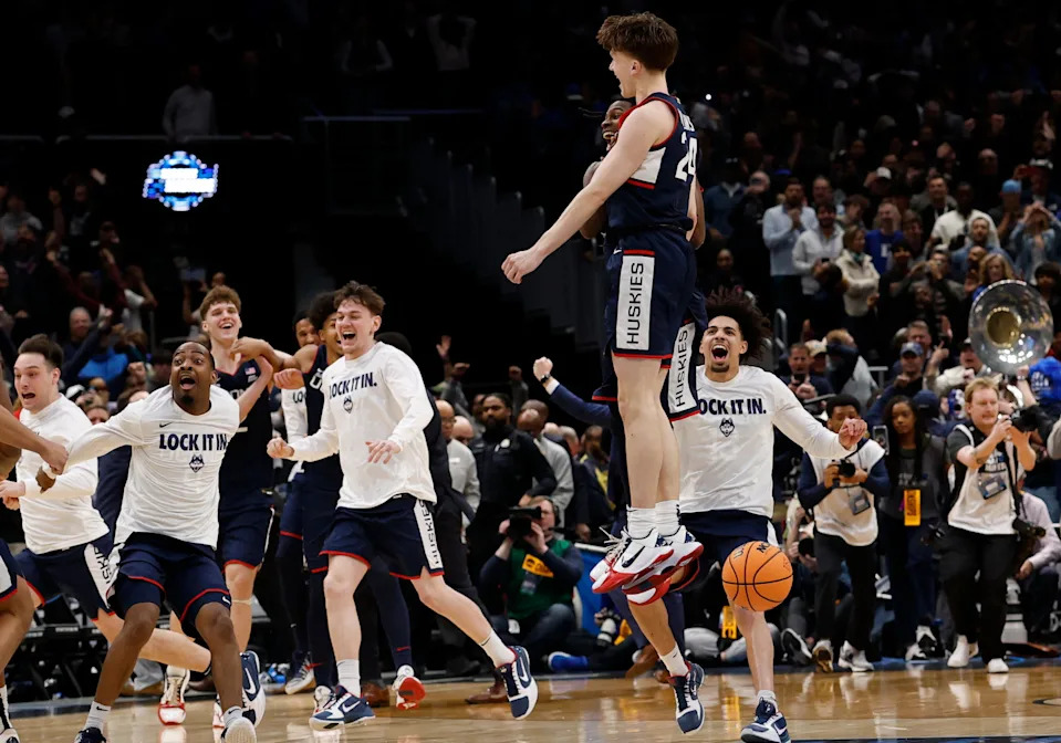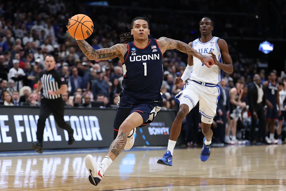 Braylon Mullins scooped up the ball around halfcourt and dished to Alex Karaban, who gave it right back. Mullins then drained the 35-footer with 0.4 seconds left to beat Duke and send UConn to its third Final Four in four years.