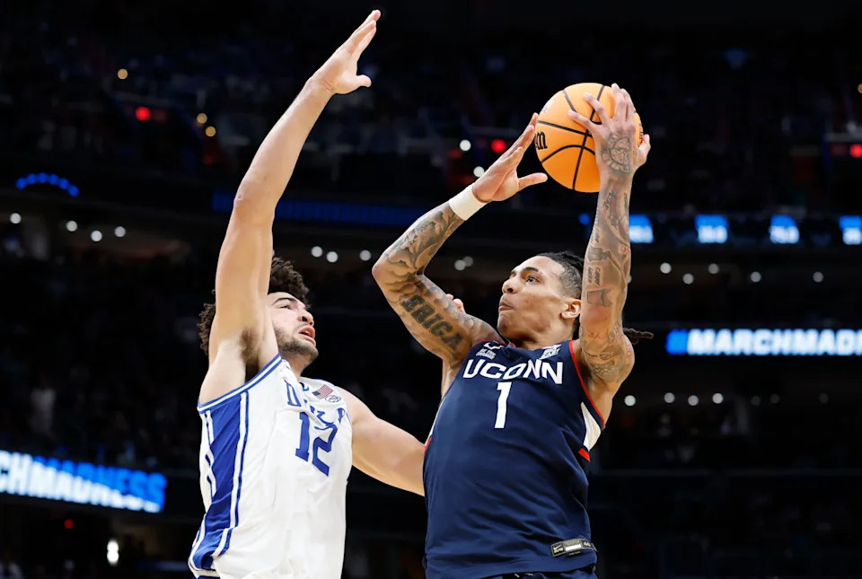 UConn Huskies guard Solo Ball (1) scores against Duke Blue Devils forward Cameron Boozer (12) and is fouled in the second half during an Elite Eight game of the East Regional of the men’s 2026 NCAA Tournament at Capital One Arena.