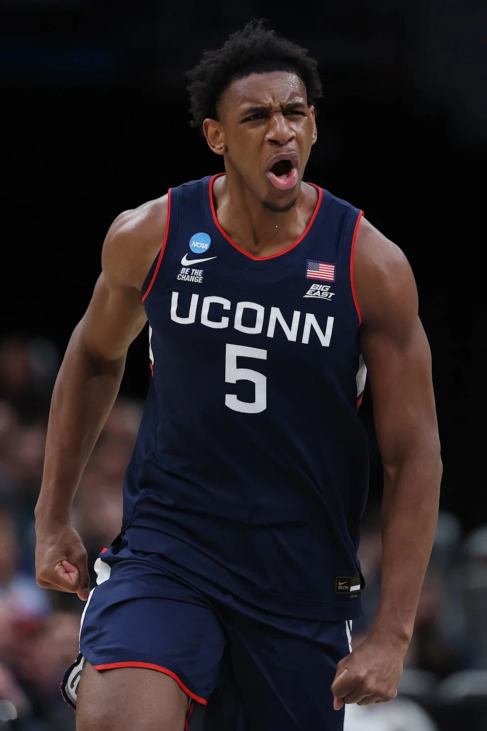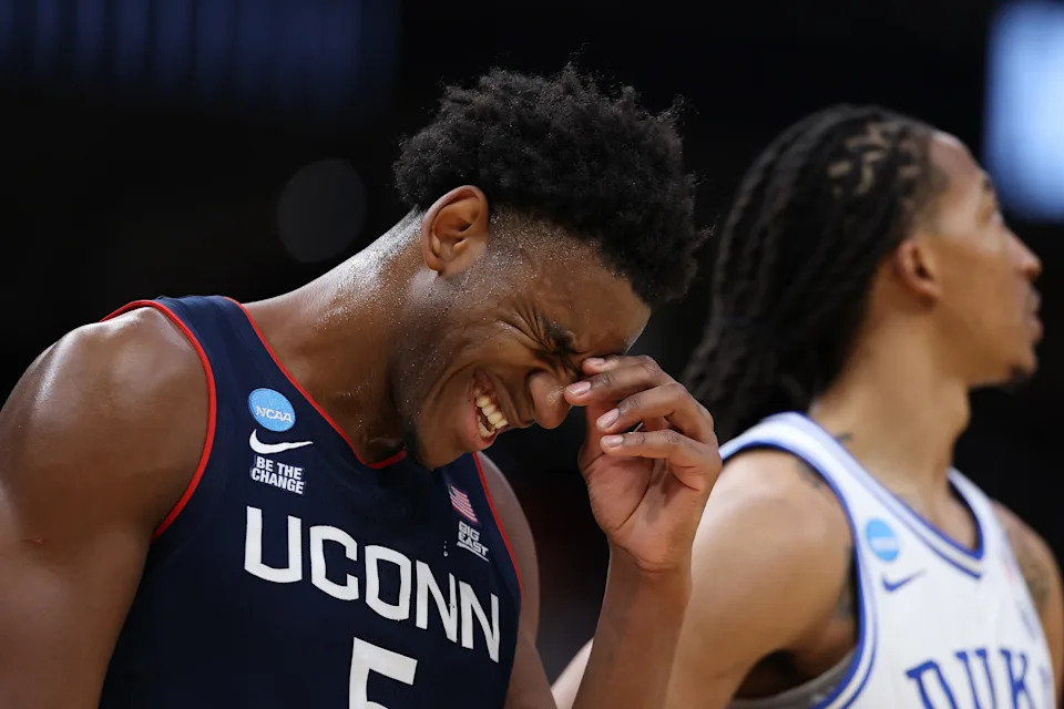 Tarris Reed Jr. #5 of the UConn Huskies reacts during the first half of a game against the Duke Blue Devils in the Elite Eight of the 2026 NCAA Men’s Basketball Tournament at Capital One Arena on March 29, 2026 in Washington, DC.