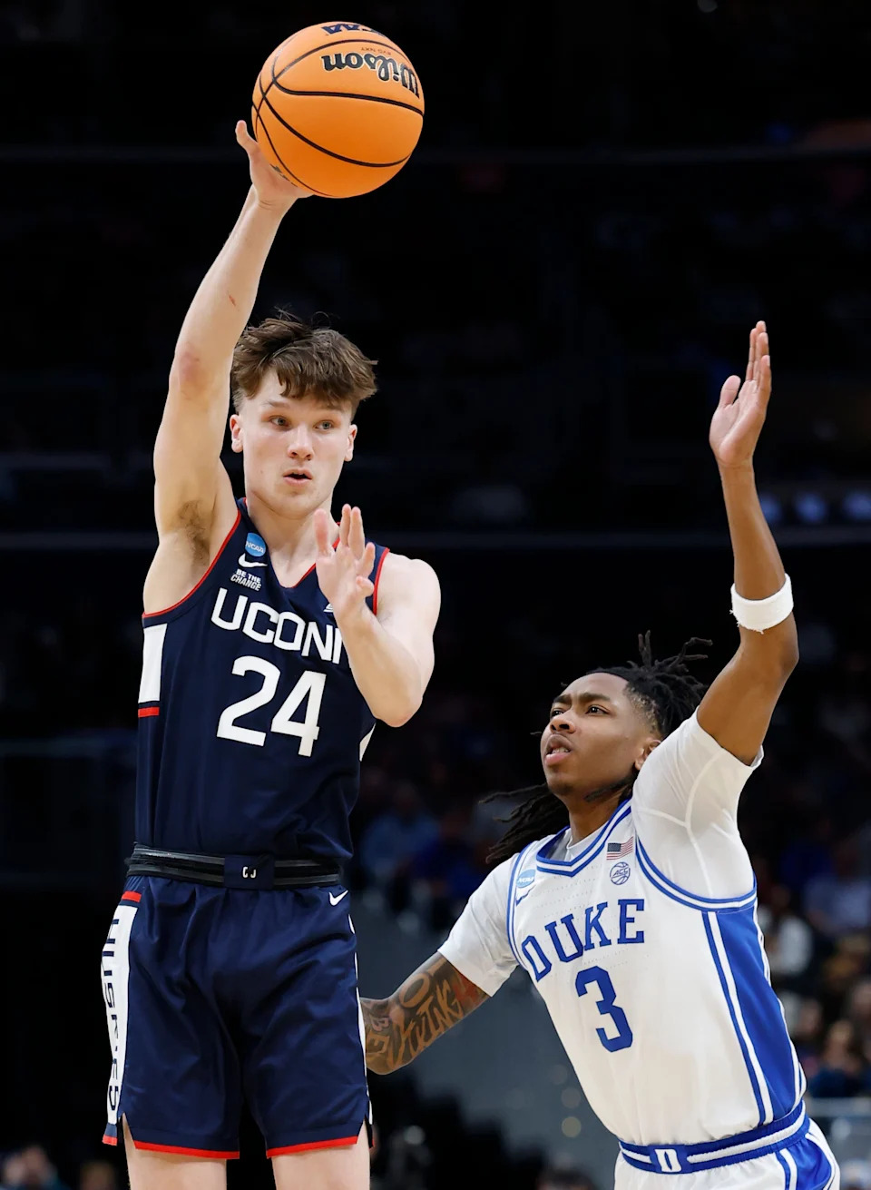 UConn Huskies guard Braylon Mullins (24) passes the ball against Duke Blue Devils guard Isaiah Evans (3) in the second half during an Elite Eight game of the East Regional of the men’s 2026 NCAA Tournament at Capital One Arena.