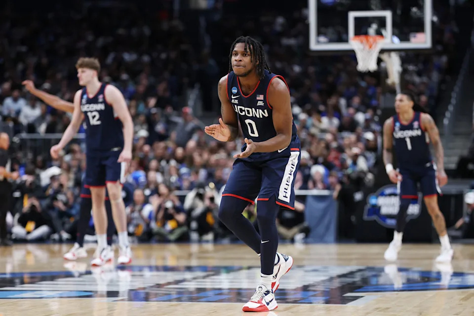 Malachi Smith #0 of the UConn Huskies reacts during the first half of a game against the Duke Blue Devils in the Elite Eight of the 2026 NCAA Men’s Basketball Tournament at Capital One Arena on March 29, 2026 in Washington, DC.