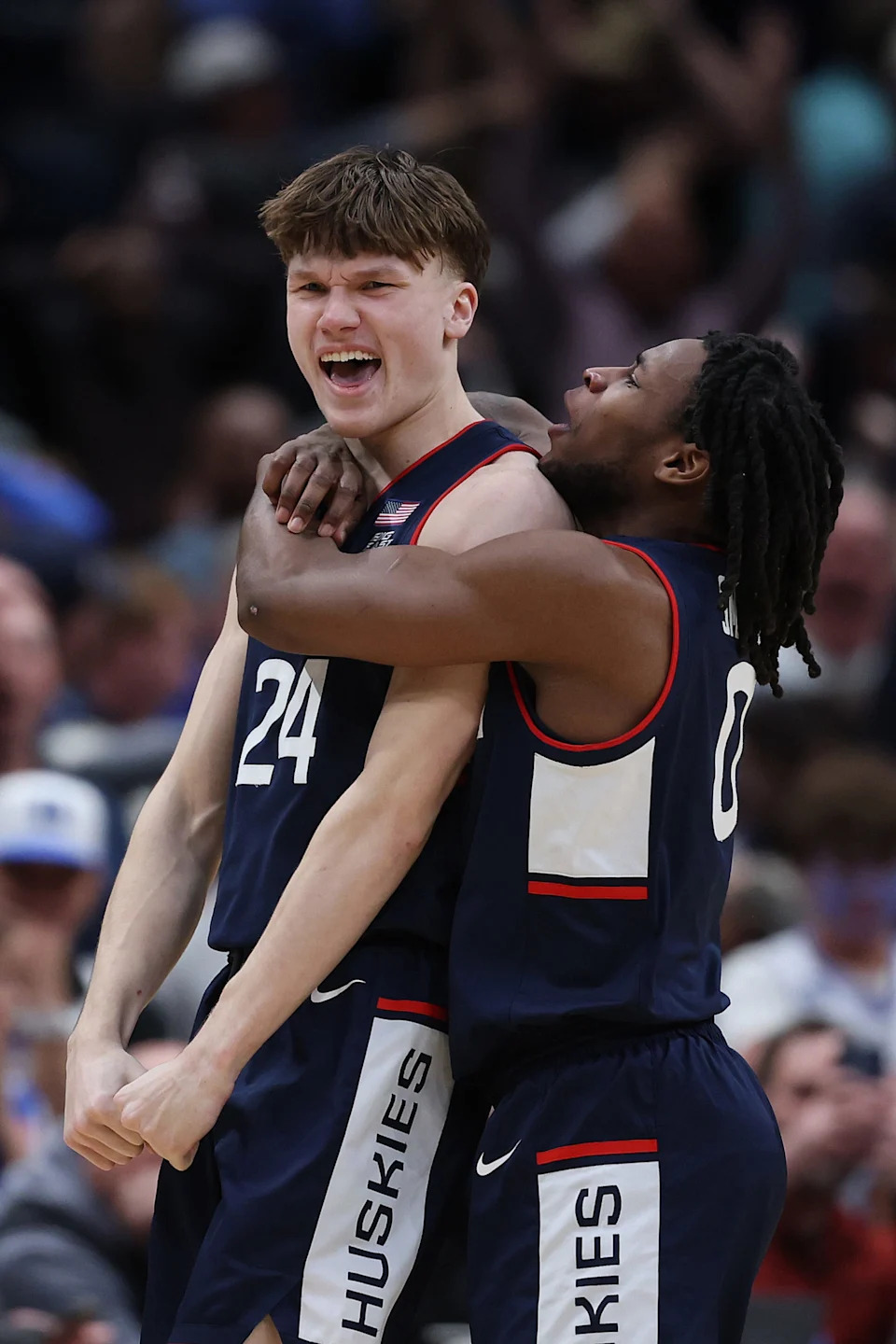 UConn Huskies guard Malachi Smith (0) celebrates with UConn Huskies guard Braylon Mullins (24) after a game-winning three-point basket against the Duke Blue Devils in the second half during an Elite Eight game of the East Regional of the men’s 2026 NCAA Tournament at Capital One Arena.